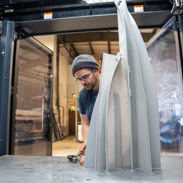 These parts are being removed from the print bed for test fitment. Once the product tolerances are accepted we will then produce the molds to manufacture these sections at scale through vacuum forming.
