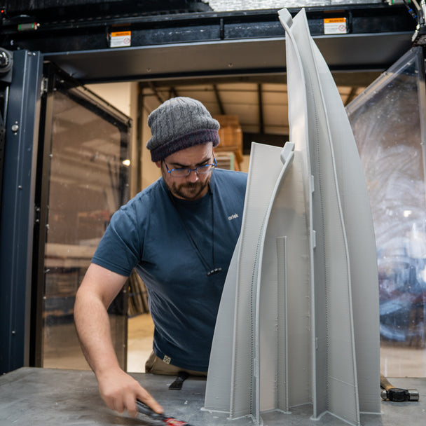 Ted Peacher - Lead Product Development Engineer peeling off test models from our Massivit 10000-G Large Format 3D Printer.