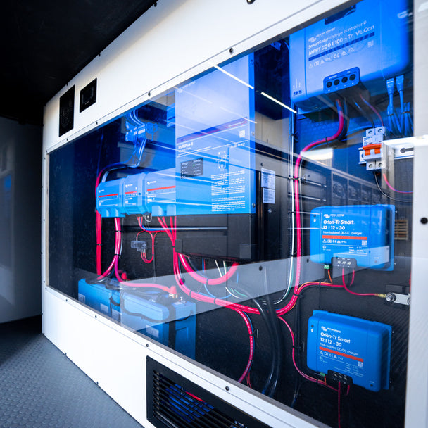 By leveraging advanced chassis integration and real-time system data, we eliminated the need for traditional generators through automated vehicle start/stop functionality. This system works in tandem with a Victron Energy lithium battery bank and a remote trigger, enabling intelligent energy management and seamless power continuity.