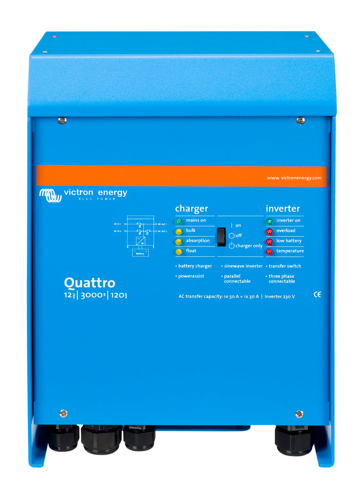 Similar to the MultiPlus, the Quattro is also a combined inverter and charger. Additionally it can accept two AC inputs and automatically connect to the active source. Its many features include a true sine wave inverter, adaptive charging, hybrid PowerAssist technology plus multiple system integration features such as three or split phase operation and parallel operation.
